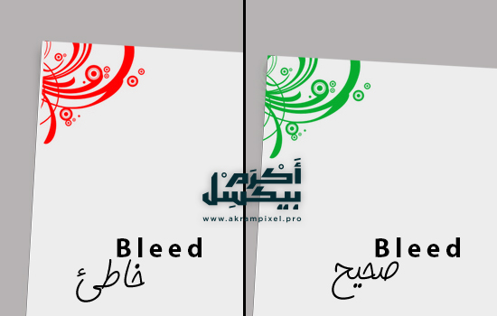 - Bleed (الهامش الإضافي): هو مساحة إضافية تضاف على جوانب التصميم وتتجاوز الحجم النهائي للورقة. هذه المساحة ضرورية لضمان عدم وجود حواف بيضاء غير مرغوبة بعد عملية القص. يجب أن تمتد الخلفيات أو العناصر التي تصل إلى حافة التصميم إلى منطقة الـ Bleed. عادةً ما يكون هذا الهامش بين 3-5 مم.