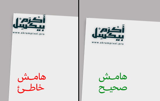 - المنطقة الآمنة (Safe Area): هي منطقة داخلية تُترك قبل الهامش الأخير بمسافة صغيرة. يجب أن تكون جميع النصوص والشعارات والعناصر المهمة داخل هذه المنطقة لضمان عدم قصها أو وقوعها قريباً جداً من الحافة النهائية للورقة.
